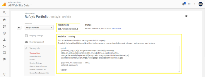 From the following screen, grab your Tracking ID and JavaScript code from under the Website Tracking section and paste it in a text file.