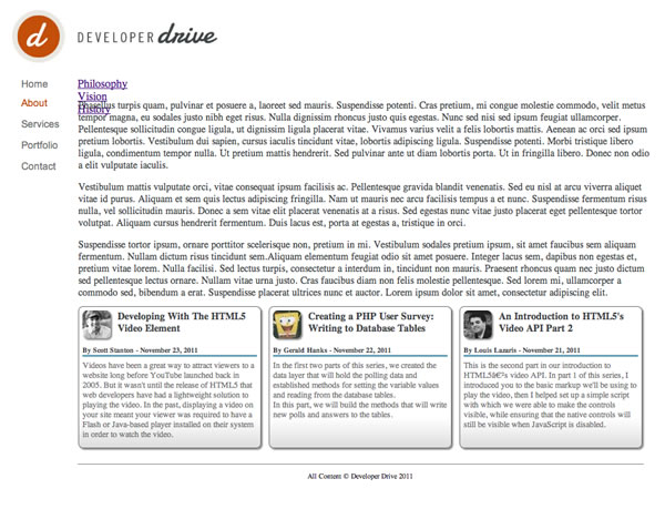 Once you’ve got your links styled and in place, you should be done with you sub-page and just some minor tweaking of a few pages away from completing your site.  If this is too minimal for you, try wrapping your main text in a box with rounded corners, a slight gradient, and a drop shadow, just like we did with the three small boxes at the bottom.