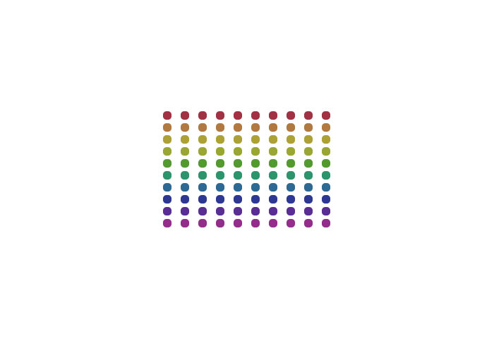 });All of our JavaScript code will be placed inside this function. We are building a simple interactive element in which a grid of colored shapes will animate on user interaction with the mouse. The element will be ten shapes in width and height, with the colors reflecting a rainbow palette: