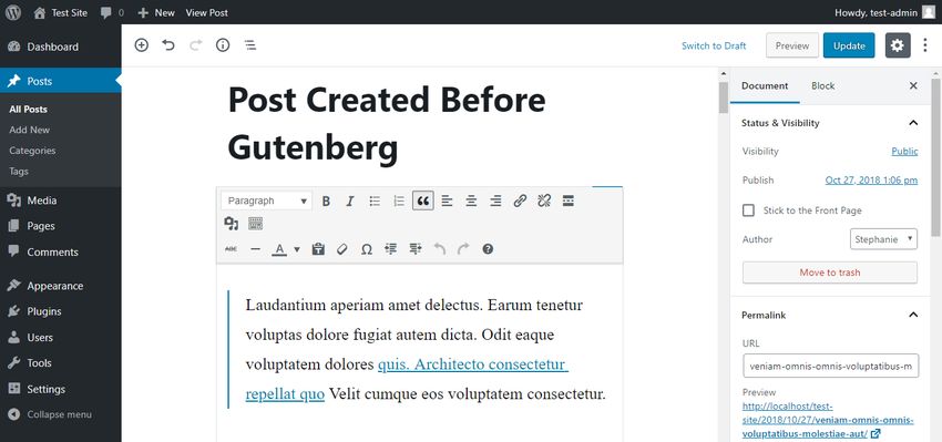 Posts and pages created before Gutenberg are refactored as a single Classic block. So, we don’t have to worry about existing content, as Gutenberg takes care of it all. Using the Classic block’s built-in TinyMCE interface, we can easily update the refactored posts with new content, too.